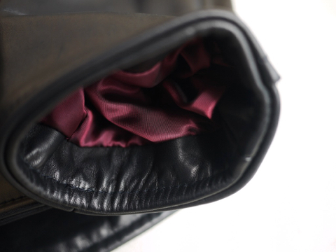 未完成で不思議なシルエットを生む為、襟元は切替のない一枚革での造り。