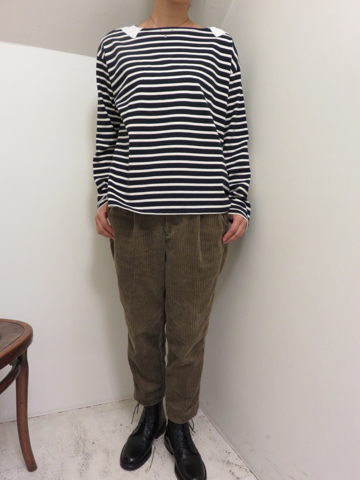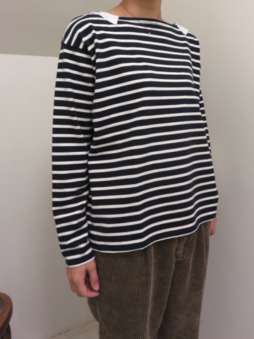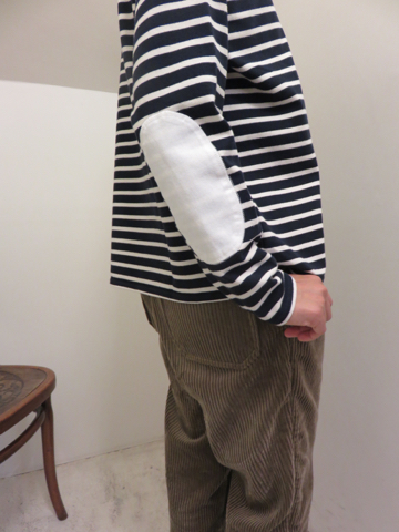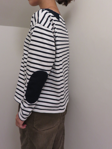 ボートネックの衿周りとエルボー部分に当て布が特徴的です。