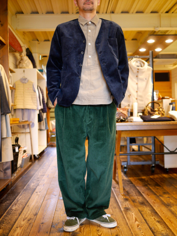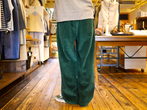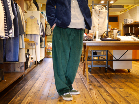 こちらは太畝のコーデュロイ素材を使用したワイドパンツ。