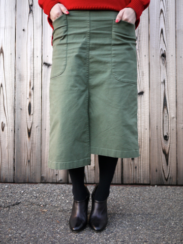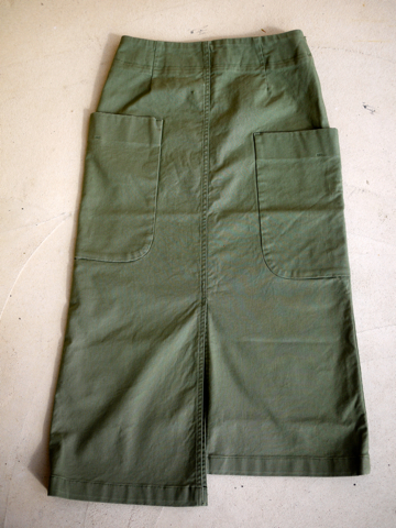 左右のスカート丈と大き目なポケット位置