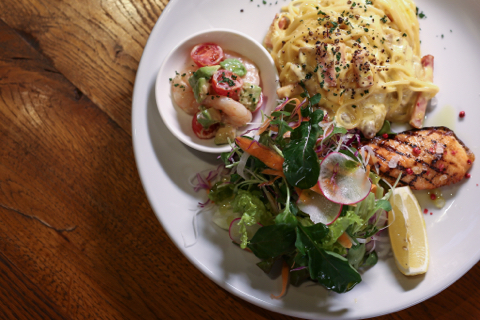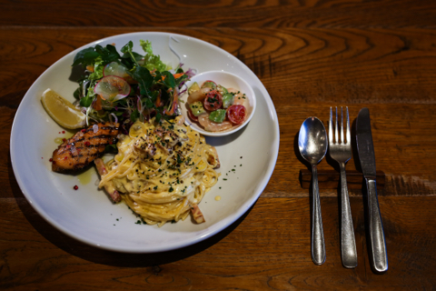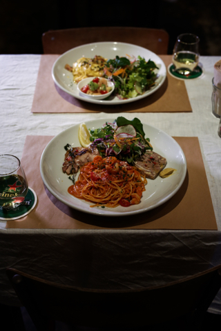 プレートはたっぷりサラダ、一口前菜、本日のパスタ、