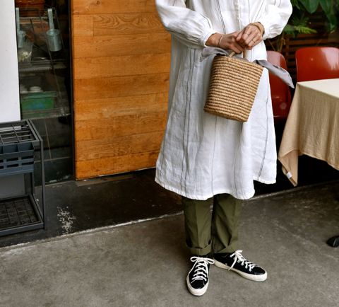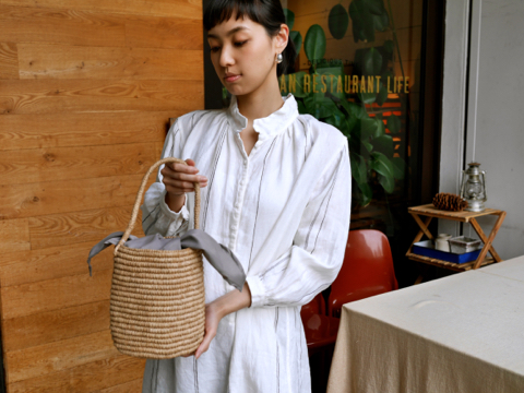 一緒にスタイリングしたのは、上をリボンで結ぶなんともかわいらしいかごバッグ。