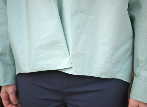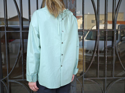 首の後ろ側にはドローコードでリボン、後ろはボタン仕様です