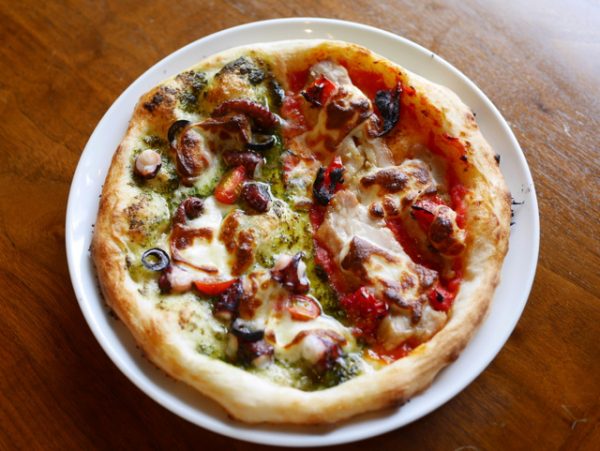 地場産の蛸と黒オリーブの実のバジルピザのハーフ&ハーフ