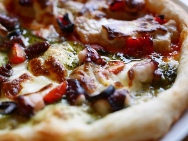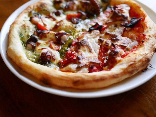 *地場産の蛸と黒オリーブの実のバジルピザ