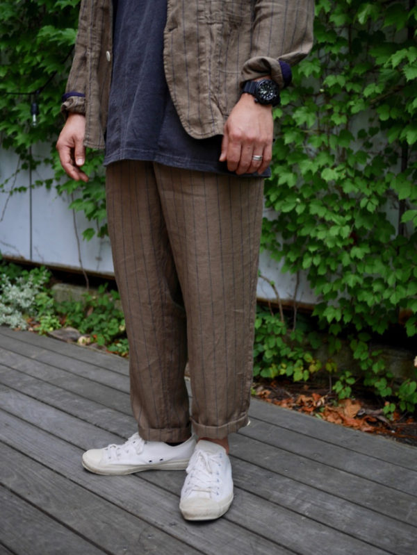 ウエストはゴム、ドロコード入りのベルトレスで、