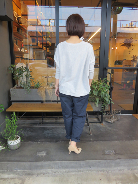 メンズライクなチノパンと合わせても、どこか女性らしい後ろ姿…