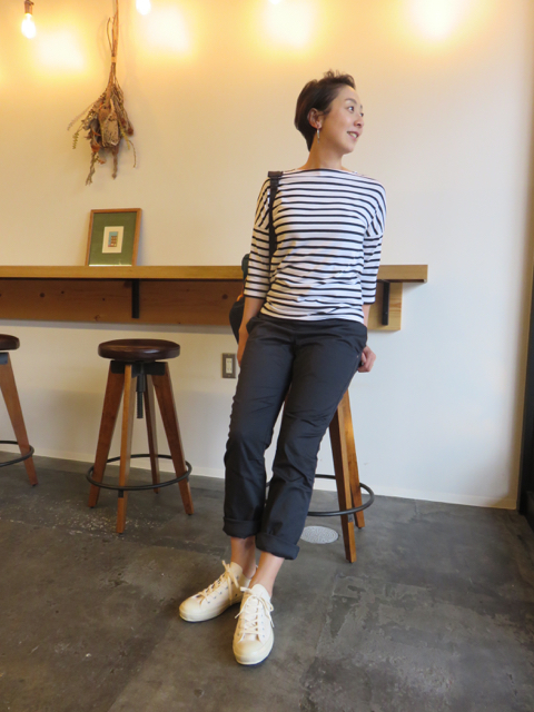 裾をロールアップして、チノパンのようなシンプルなパンツに変身。