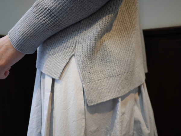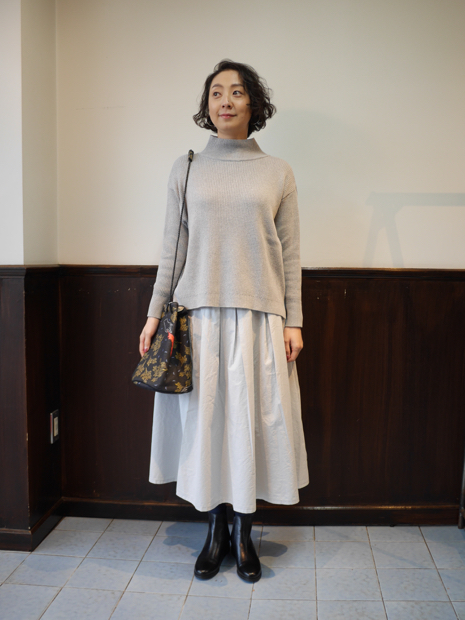 着用しているLe pivotのコットンタックスカートも新色(アイスグレー)が登場。