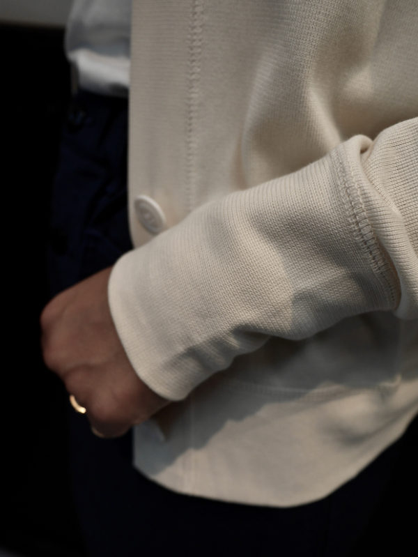 少し肩が落ちるリラックス感のあるシルエットですが、アームも着丈もスッキリ。