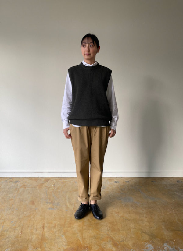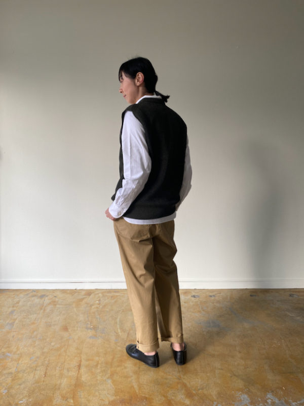 とてもウエストがゴム仕様のパンツとは思えない美しいシルエット。ゆえに