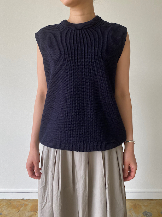 暑い夏はタンクトップをinに着て、ノースリーブニットとしての着用も女性ならでは。
