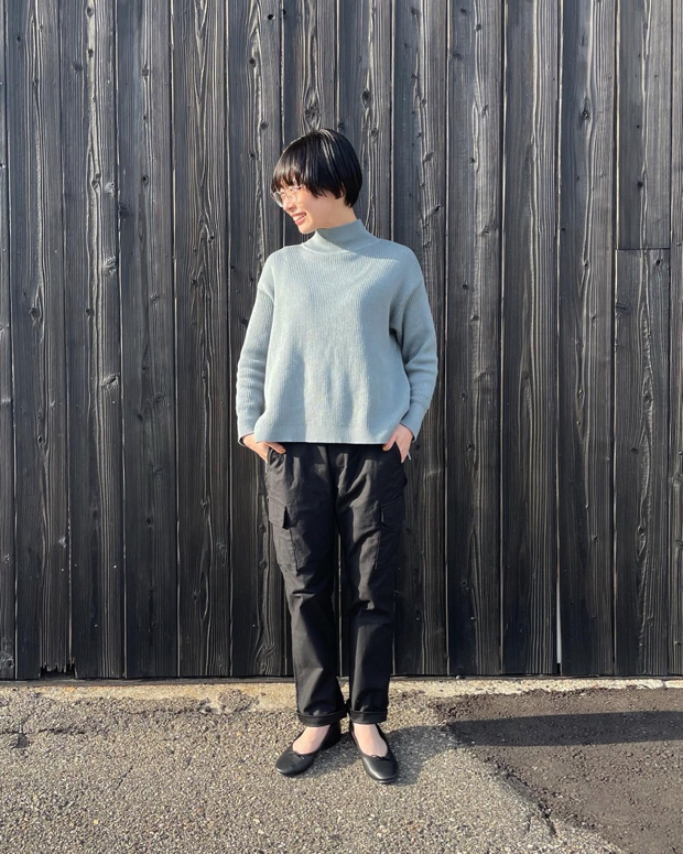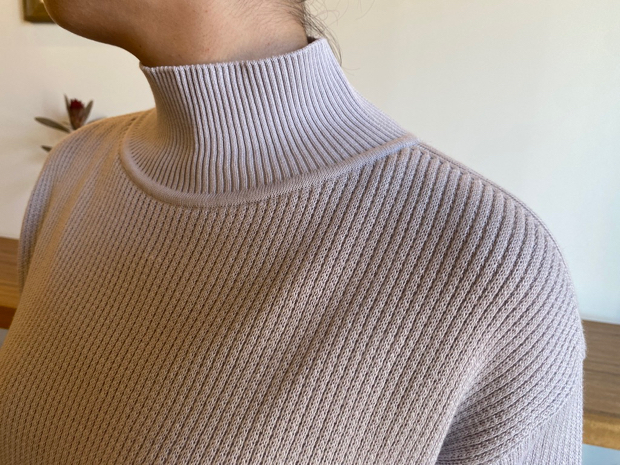 ネック周りはゆとりがあり、程よい高さのハイネックなので、タートルが苦手。