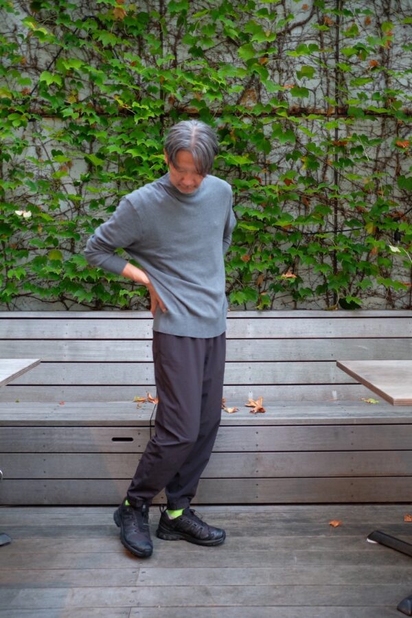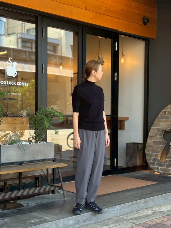 裾にかけてテーパードさせ、更にゆるくゴム仕様でアクセントをプラスしたデザイン