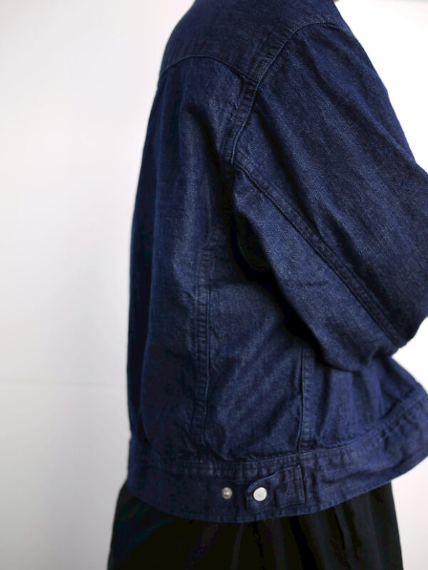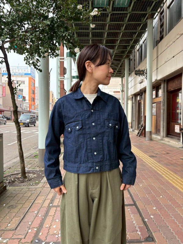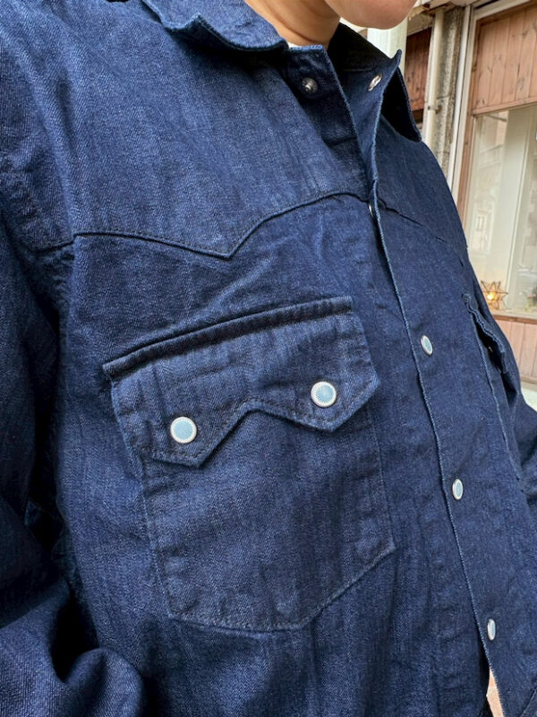 ウエスタンシャツをベースにしたデニムジャケットは、8ozの軽いデニム生地を使用。